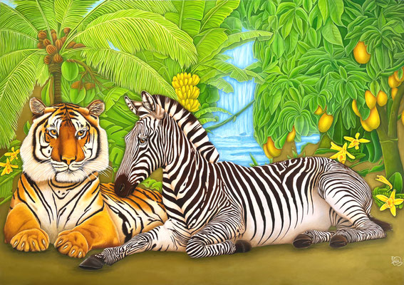 “The 15th-century master-style hyperrealistic painting depicts a majestic tiger and a striped zebra lying in peaceful repose within a lush, dense jungle. Sunlight filters through a canopy of broad green leaves, casting dappled light across their coats. Framing the scene are tall, swaying coconut trees and clusters of ripe bananas, vanilla blossoms, and hanging mangoes that add tropical color and fragrance. A gentle cascading waterfall in the background creates a tranquil, misty atmosphere, its soft roar blending with the rustle of leaves. Impeccable attention to detail shines in the animals’ fur textures and the layered, verdant foliage, capturing a serene moment of coexistence between two vastly different species. The artwork conveys a message of peaceful coexistence between different cultures and behaviors, illustrating harmony and mutual respect across species.