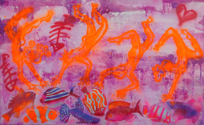 Hip Hop Fish 2021 Mixed media with neon spray aluminium on canvas 89 x146cm -available